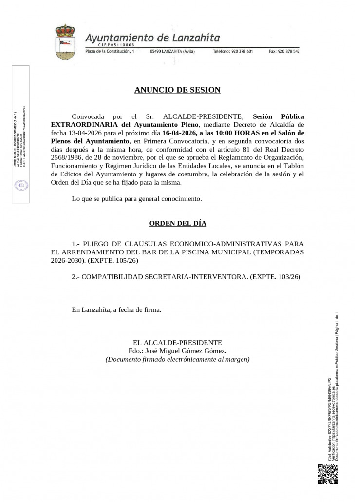 ANUNCIO SESIÓN EXTRAORDINARIA DEL AYUNTAMIENTO PLENO, EL 16 DE ABRIL DE 2026.