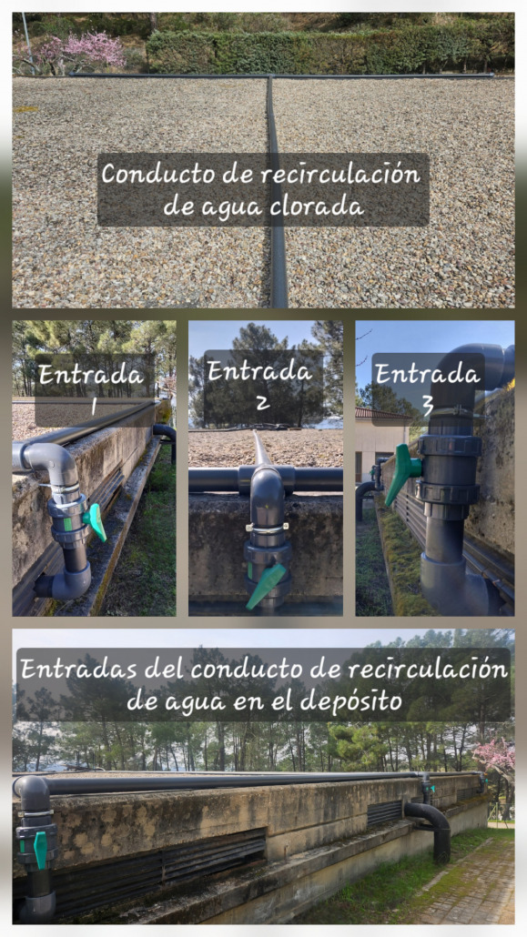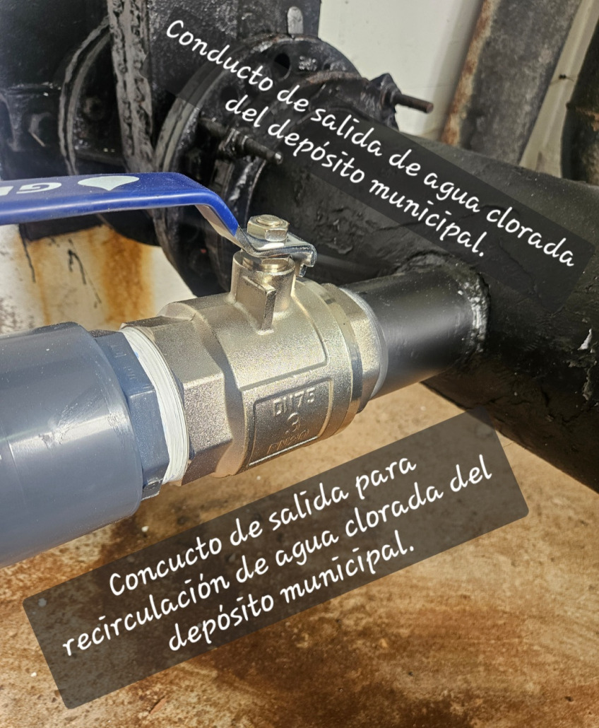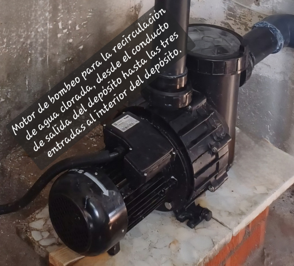 Finalmente, el agua se conduce hasta el depósito, donde se trata siguiendo la normativa sanitaria, se almacena, y desde donde por último se distribuye a la red general. Hace unos días, se ha ejecutado una obra para que, por una parte, la distribución de cloro dentro del vaso del depósito sea constante y homogénea y que, por otra parte, se incremente el caudal y la velocidad de recirculación de agua en el vaso, al incrementar las entradas de una a tres, aumentar el calibre de los tubos de conducción y emplear un motor de bombeo más potente. Esta obra ha tenido un coste de 6.963,01 euros.