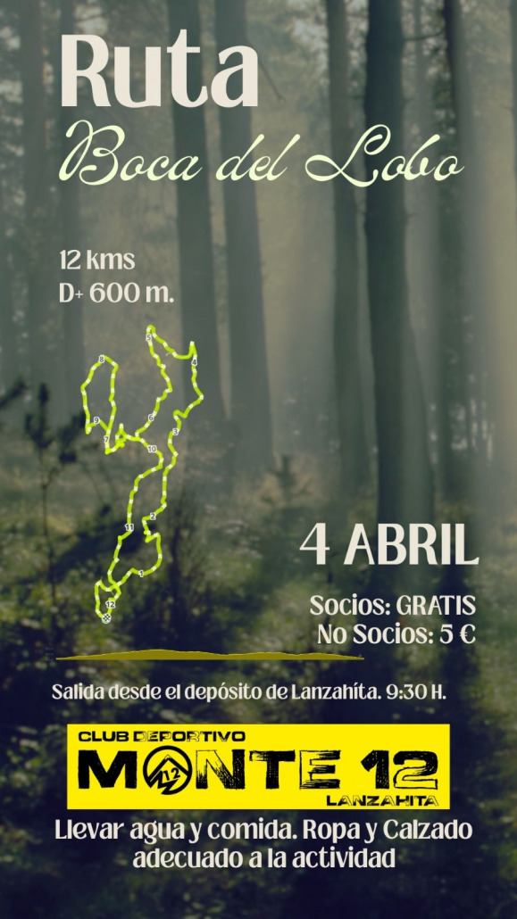 El Club Deportivo Monte 12 organiza una ruta por la Boca del Lobo el próximo sábado 04 de abril. La salida será a las 09:30h desde el depósito de agua.